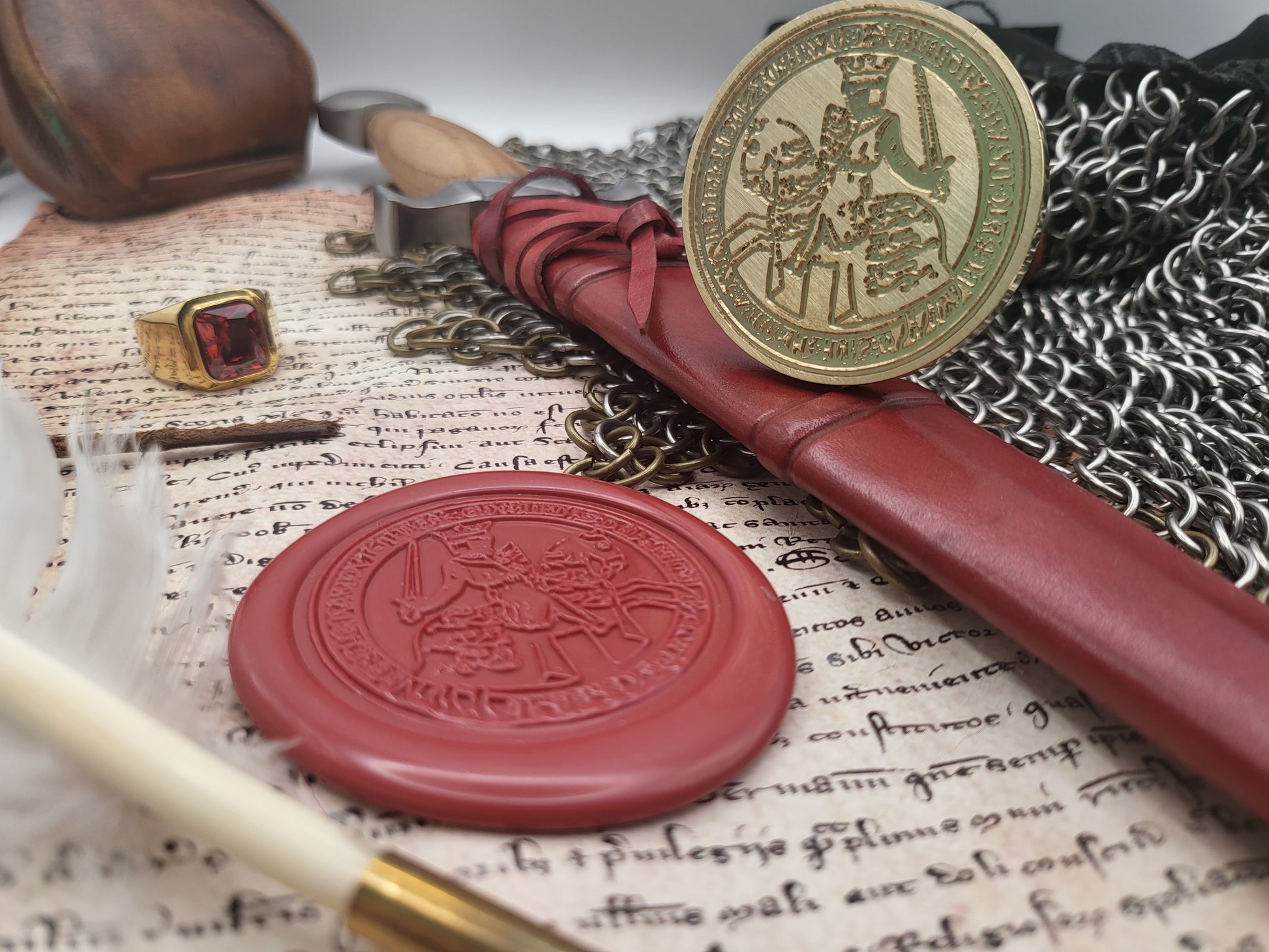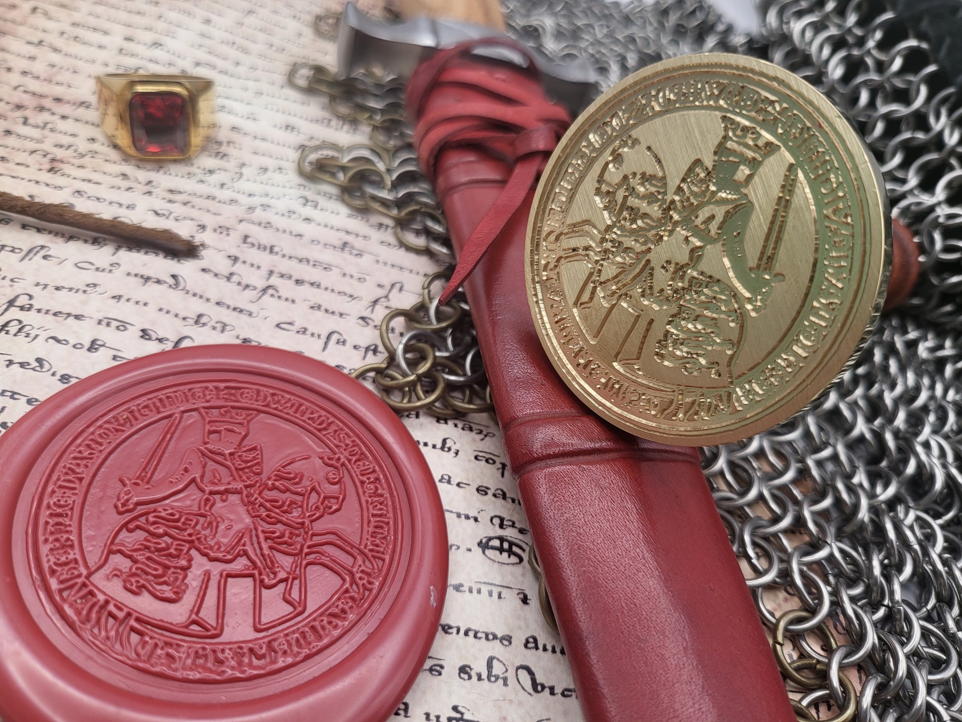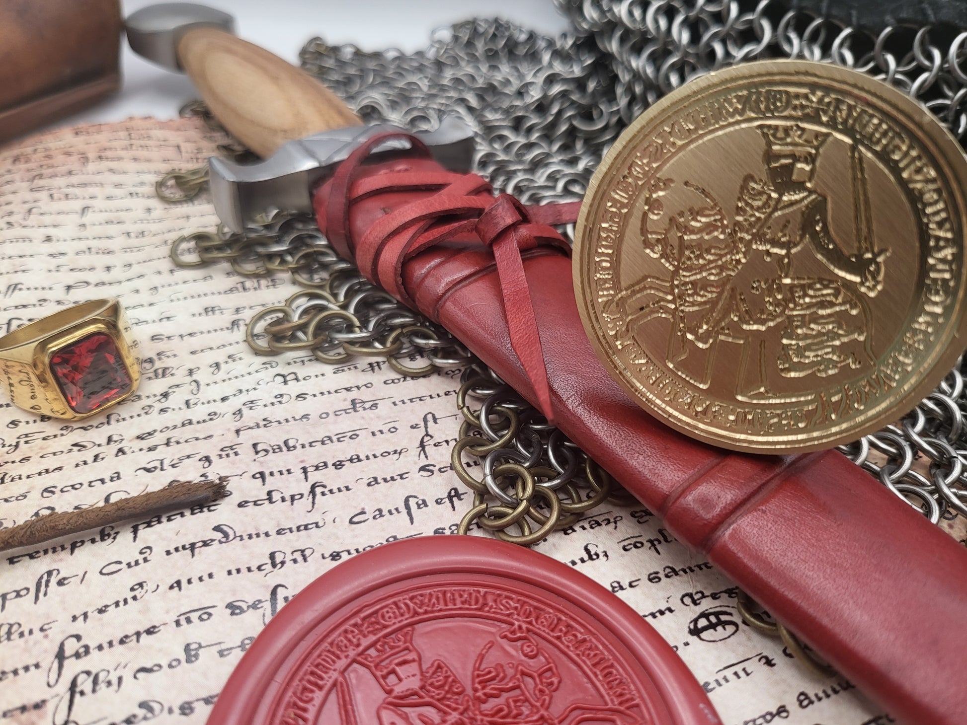 This wax sealing stamp is based on the Great Seal of the Realm used by King Edward I of England (r. 1272–1307), also known as "Longshanks" due to his imposing height. The Great Seal served as the monarch’s official mark of authority, used to authenticate royal documents, charters, and legal decrees throughout the kingdom.